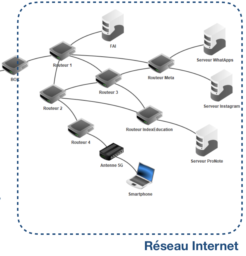 Se connecter au serveur ProNote depuis un poste informatique du réseau local. Se connecter depuis le smartphone en 5G au serveur WhatApps. Si le routeur 2 devient Hors Service, quel est l'impact ? |