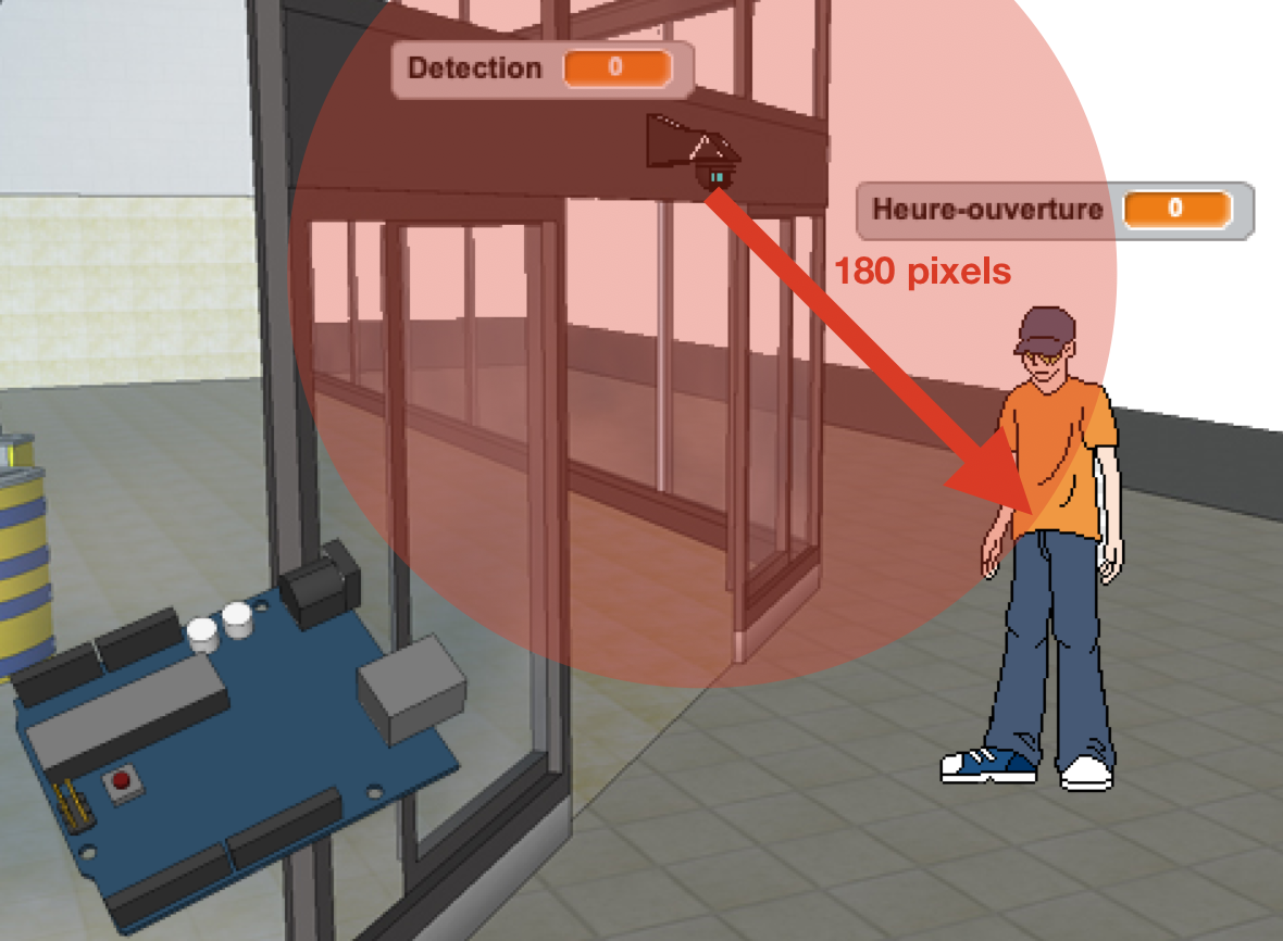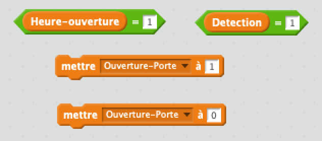 Dans l'objet Interface Programmable : Créer une variable "Ouverture-porte". Proposer un programme qui permette la gestion de l'ouverture des portes : Ouverture des portes Dans tous les autres cas, les portes restent fermées (horaire de fermeture et/ou non présence de client).