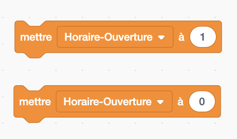 Dans l'objet Interface Programmable : Créer une variable "Ouverture-porte" pour tous les sprites. Proposer un programme qui permette la gestion de l'ouverture des portes : Ouverture des portes si Dans tous les autres cas, les portes restent fermées (horaire de fermeture et/ou non présence de client).