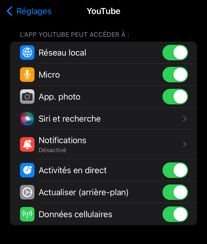 Voici la capture d'écran des réglages de l'application Youtube installée sur mon smarpthone. Lister les possibilités que peut faire l'application sans manipulation de ma part. |